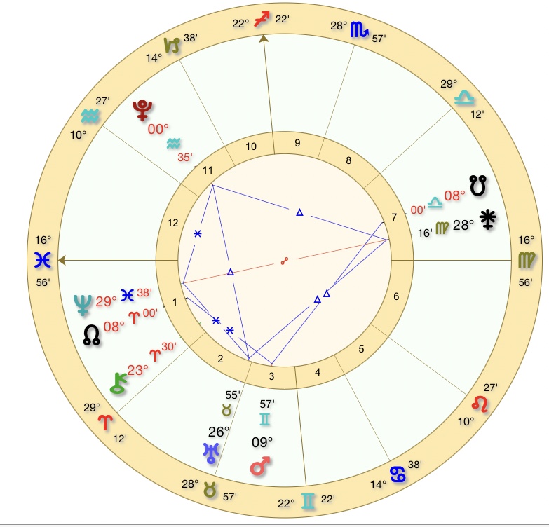 新月図で注目すべき点、というか2回目山羊座満月から続いているのですが海王星を頂点としたカイトが出来ています。8月下旬まで続くこのカイト。対人関係をあらわすジュノーが海王星とオポジション。冥王星、天王星とグランドトラインを組んでいます。カイトですから海王星は冥王星、天王星とセクスタイル。海王星は夢、理想。天王星は改革、革新、突然の変化。冥王星は破壊と再生。このカイトが新月図では海王星1ハウス、ジュノー7ハウス、冥王星11ハウス。天王星は5度ルールでは4ハウス。アスペクトが多いのでひとことで言いづらいですが『自分の夢や理想に向かうには対人関係の見直し、再構築を求められる』と読めます。今年後半から来年に向かい理想を実現するには今この課題に取り組むことが必要。カイトの頂点は1ハウスで海王星。自分自身の理想を求めるために思い切った人間関係の見直しをするべき。と。隷属的な関係や理想への生涯となる関係、ダラダラ続く生産性の無い悪い関係は捨てる、破綻するという。新月図では牡羊座のドラゴンヘッド、天秤座のドラゴンテールが双子座の火星とアスペクト。これも自分の使命に向け人間関係を含む過去の精算。というイメージで捉えられるのです。どうですか?星の強烈なメッセージ。おおきく世の中が変わりつつある今自分の周りの関係性の見直しを迫られるというイメージは。